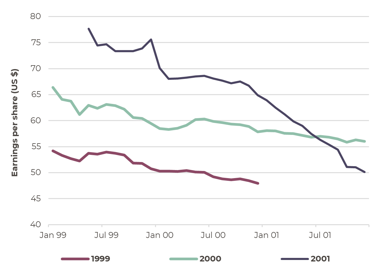 S&P 500: Expectations for earnings per share (EPS) for 1999, 2000, 2001 …. Drifting lower…. And then sinking fast