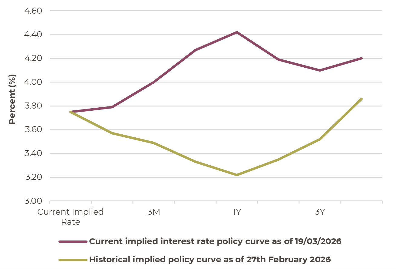 UK interest rate expectations have shifted over the past 3 weeks. Expectations of rate cuts are now anticipated by the market as shown by the implied policy interest rate curve shifting higher since the end of February 2026.