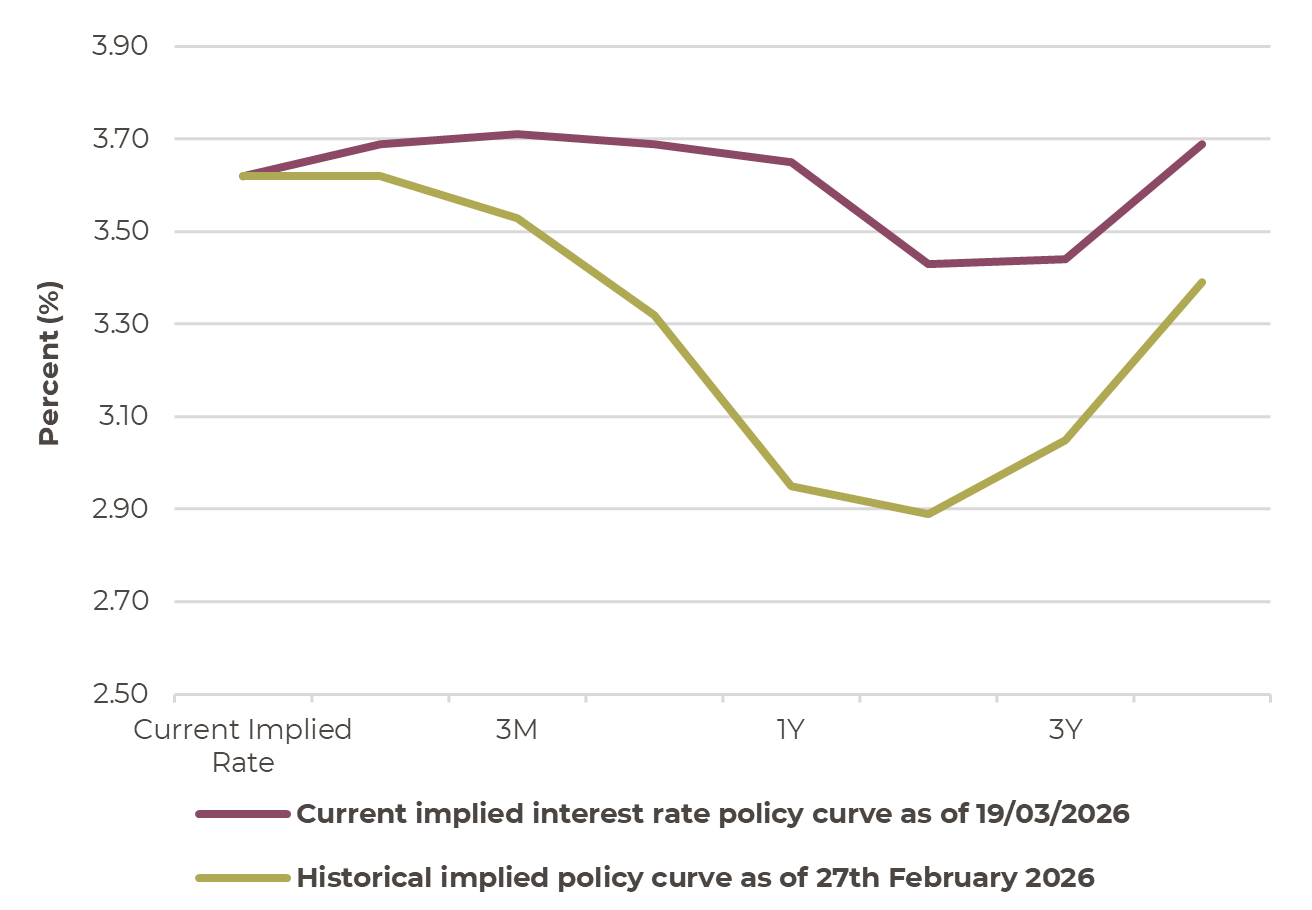 US interest rate expectations have shifted over the past 3 weeks. Fewer rate cuts are now anticipated by the market as shown by the implied policy interest rate curve shifting higher since the end of February 2026