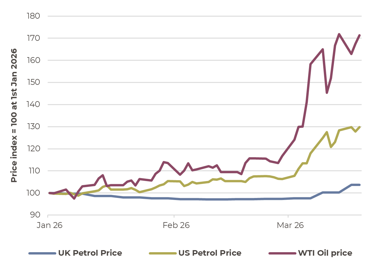 The immediate sign of the inflation shock is showing up already in petrol prices. The chart to the right shows the oil price and petrol prices in the US and UK since the start of 2026, (WTI (West Texas Intermediate) is a key benchmark price for crude oil). Oil prices have risen by around 70%, most of which has taken place since the US-Israeli attacks. US petrol prices have risen by just under 30% whilst the UK has ‘only’ seen a 4% increase since the start of the year.