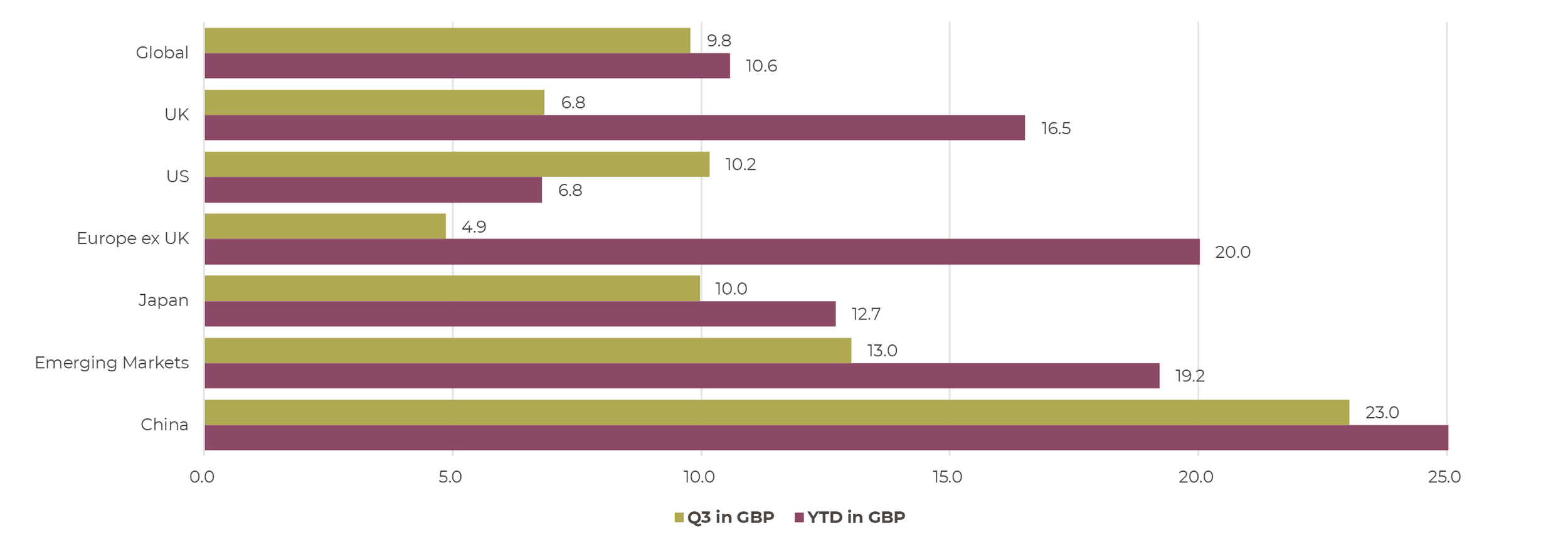 Europe continues to lead the way year-to-date but other regions are catching up. Emerging Markets have also been very strong, and in particular, Chinese equities have performed exceptionally and are up 32% this year.