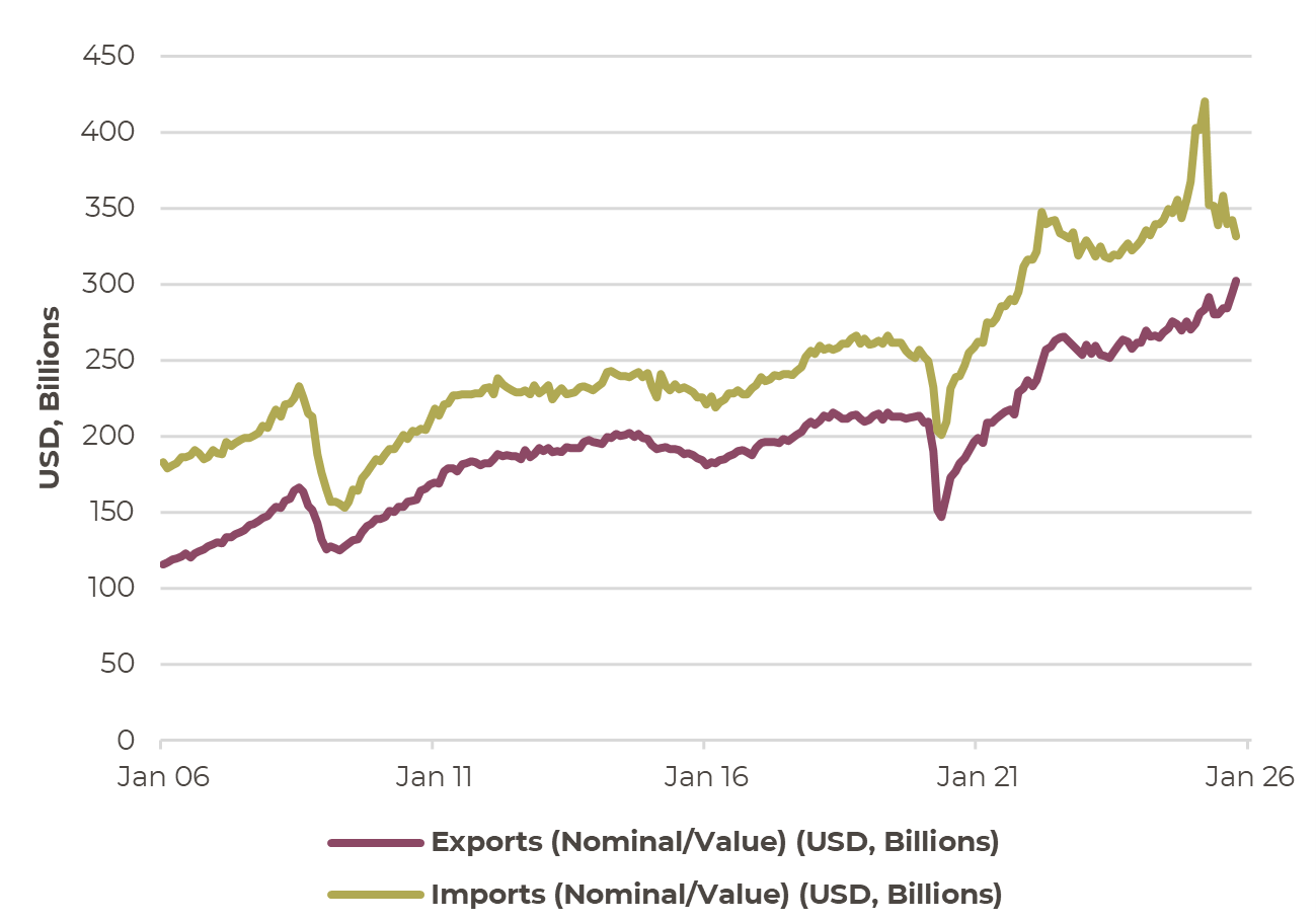 The pattern of imports shown in the chart on the right, reflects the pre-tariff import surge at the end of 2024 and the start of 2025, but since the summer of 2025, import levels have fallen back.