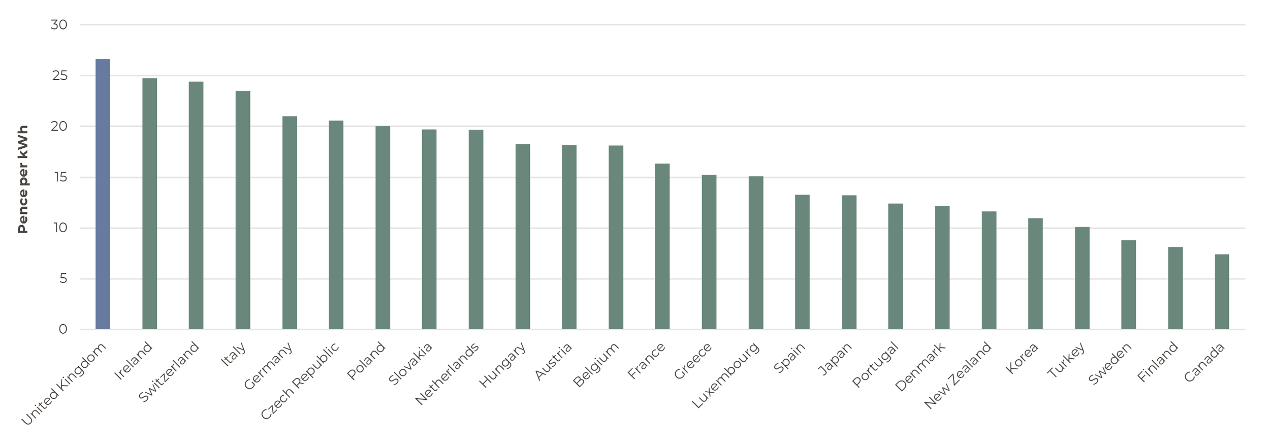 Interestingly, in absolute terms, the data suggests that Germany is also feeling the pain of high electricity prices in recent times. Domestic electricity prices in 2024 were in excess of 30p per kWh for both countries. Quite a contrast to France at just below 24p per kWh, so 22% lower than the UK. The country with the cheapest domestic energy cost in the most recent data is the US, at a staggering 58% cheaper than the UK.